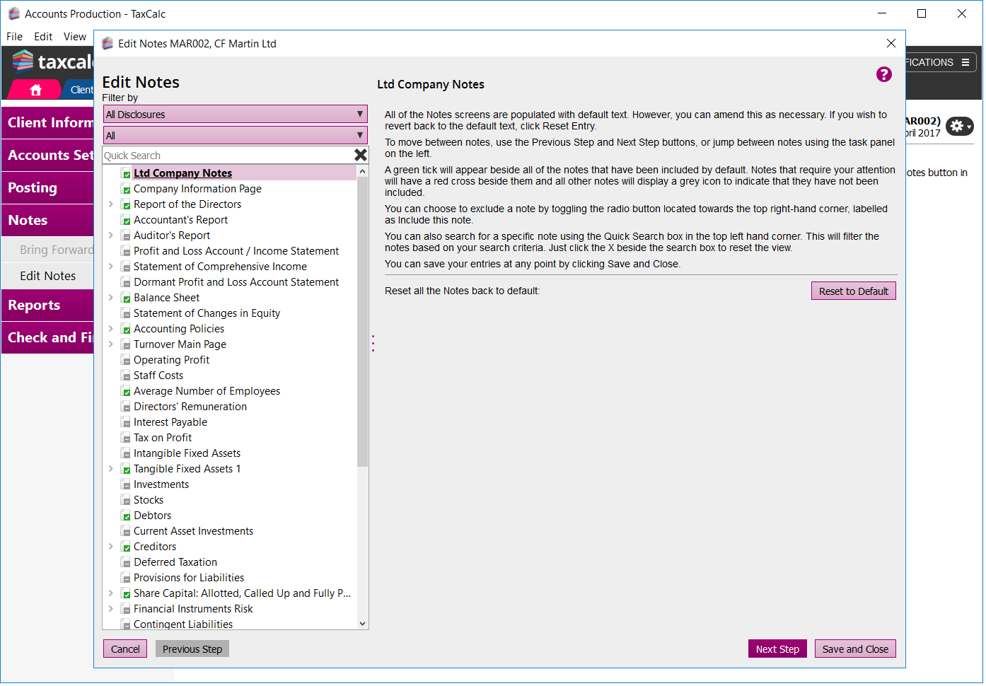 TaxCalc Accounts Production features a library of notes and disclosures that may appear on your clients' financial statements.
