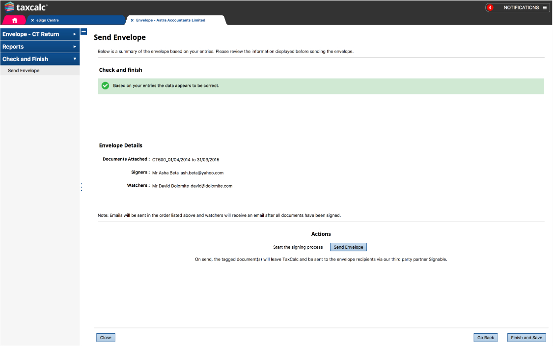 TaxCalc's Check and Finish will check your envelopes for errors before you send them to your clients.