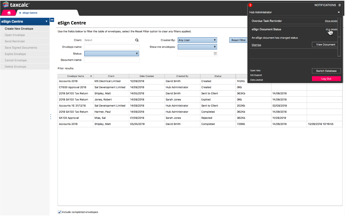 When a client responds, or signs a document you'll know right away via TaxCalc's notification centre.