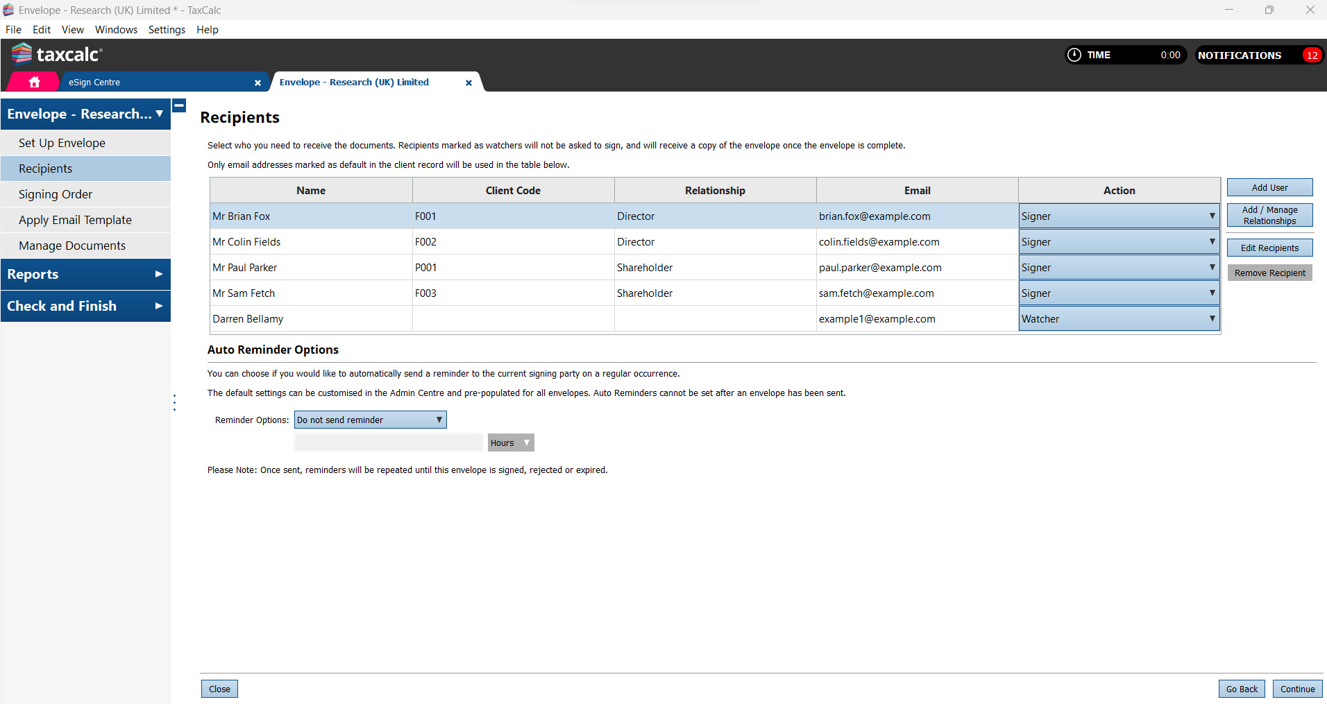 You can send envelopes to your clients, your team and anyone with a formal relationship to the client within TaxCalc such as partners, directors, secretaries, shareholders, trustees, PSCs, PRs, spouse or other family members.