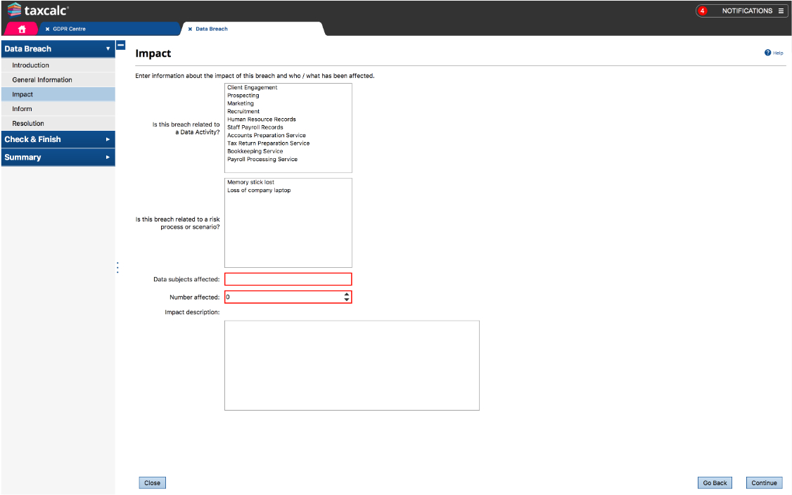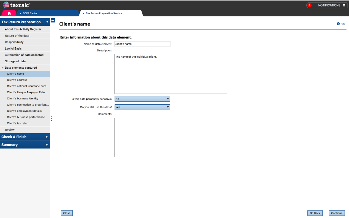 At it's core, TaxCalc GDPR Centre is a series of questionnaires and areas for you to populate and keep your practice fully compliant to the latest GDPR recommendations issued by the Information Commissioner's Office (ICO).
