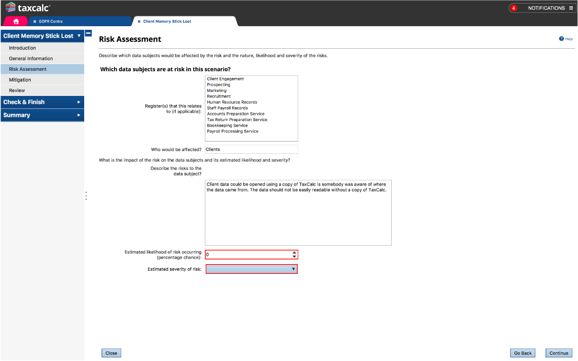 The Risk Assessments area of TaxCalc GDPR Centre allows you to identify processes that carry a risk as well as any unplanned scenarios that might occur. You can record the potential impact of each risk and define your plan of action if such a scenario arises.