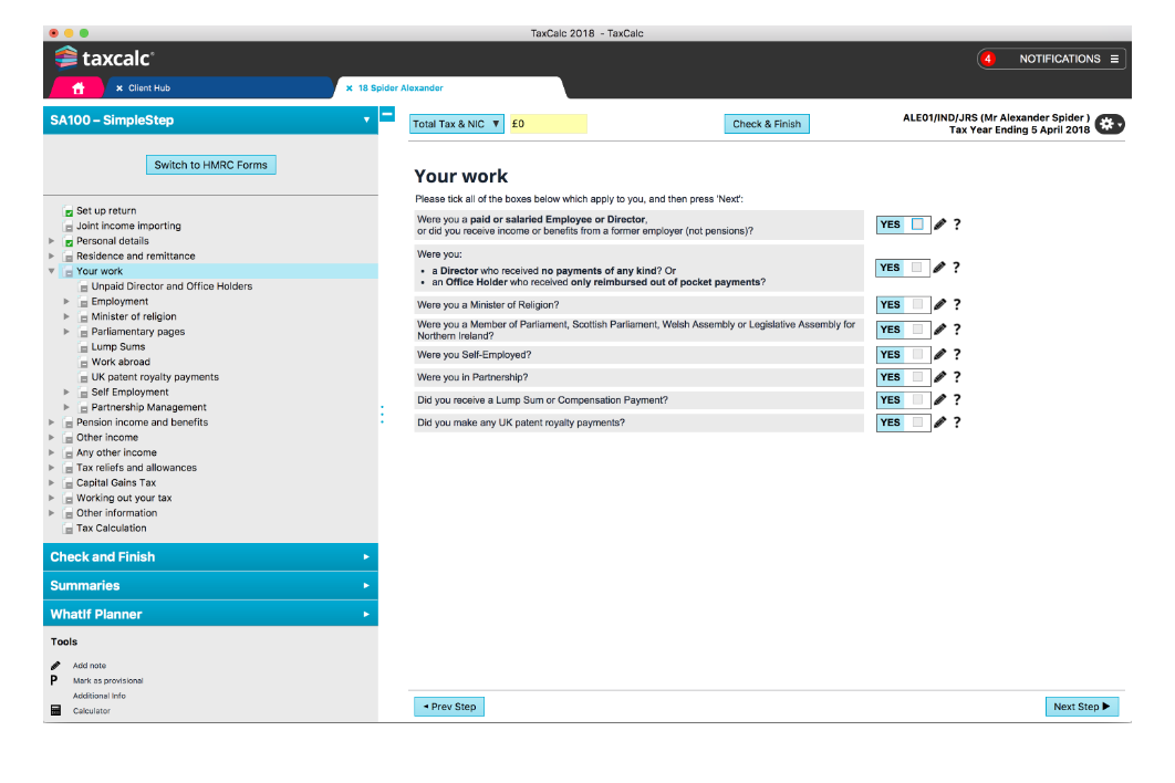 TaxCalc contains two modes of entry. SimpleStep is our unique questionnaire mode, which guides you through the return, asking questions based upon answers given and data entered.