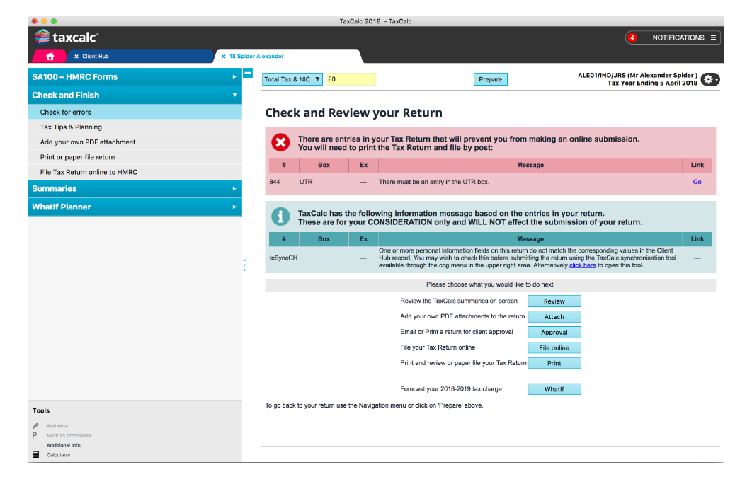 - Check and Finish routine to validate entries within the tax returns and to confirm the availability of HMRC online filing service