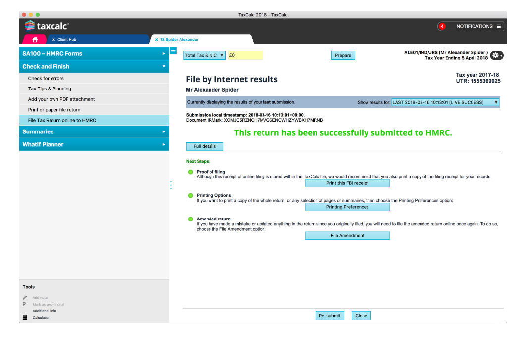 TaxCalc files your client's return online and tells you when it has been successfully received by HMRC.